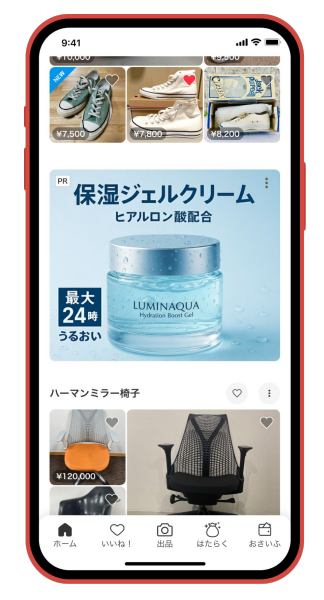 メルカリのユーザーの購買活動が活発なホームのレコメンドアイテム内で広告配信をすることが可能です。
