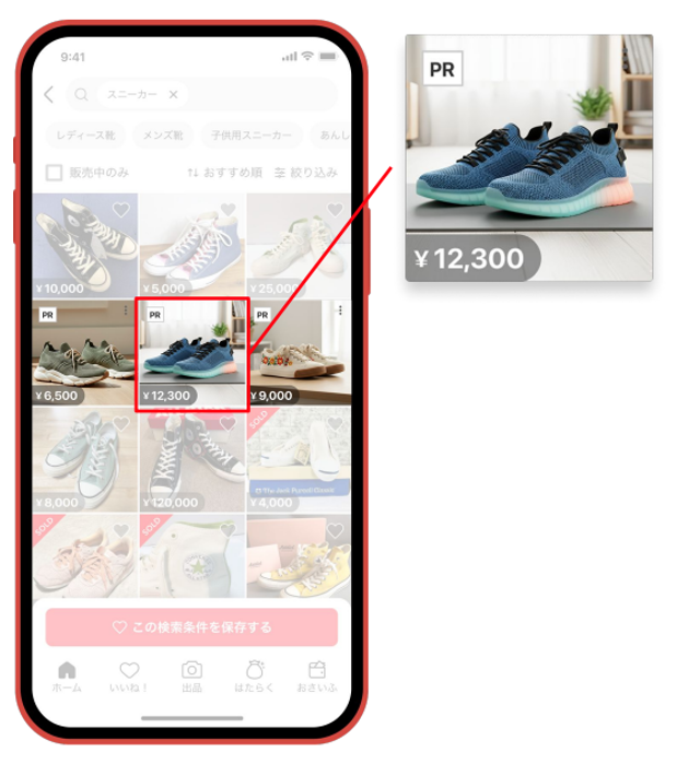 メルカリアプリの中で表示する広告です。検索結果画面において「メルカリShops」の商品が表示されやすくなるため、商品がより目立つようになり、ユーザーに見つけてもらいやすくなります。